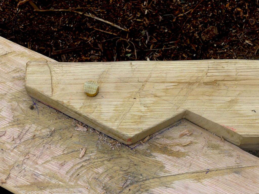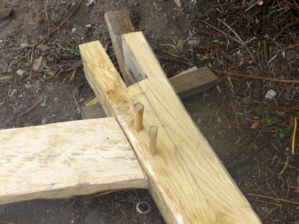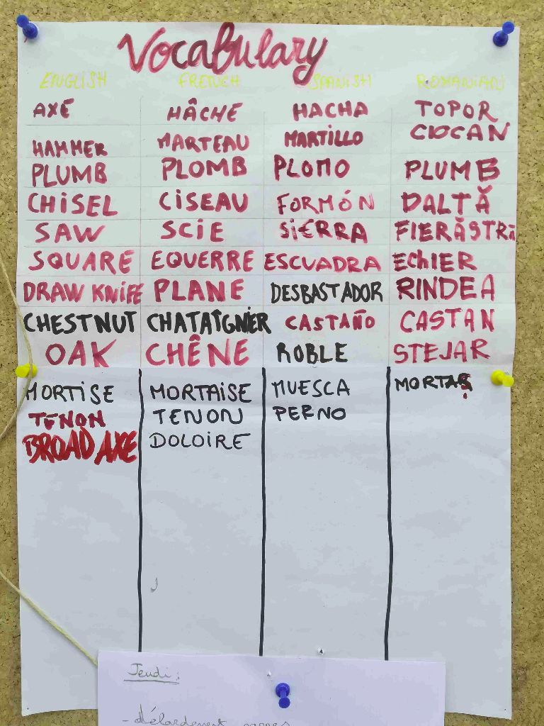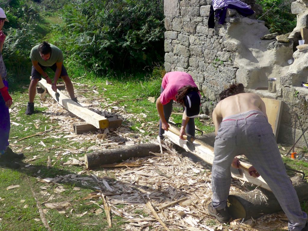 Les bois de la structure ont été équarris en amont du chantier dans le fort, sauf les liens, qui ont servi de support d'apprentissage pour les bénévoles espagnols, roumains et français de cette session de chantier. Pendant 2 semaines, ils ont pu découvrir le travail du bois parmi d'autres chantiers de réfection du fort (maçonnerie, déblaiement...)