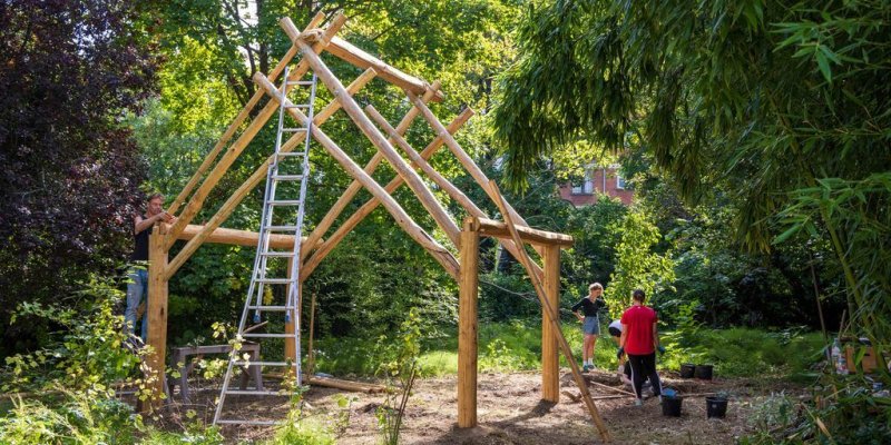 Première travée de la halle : fermes en ciseaux, châtaignier bruts et bambous.